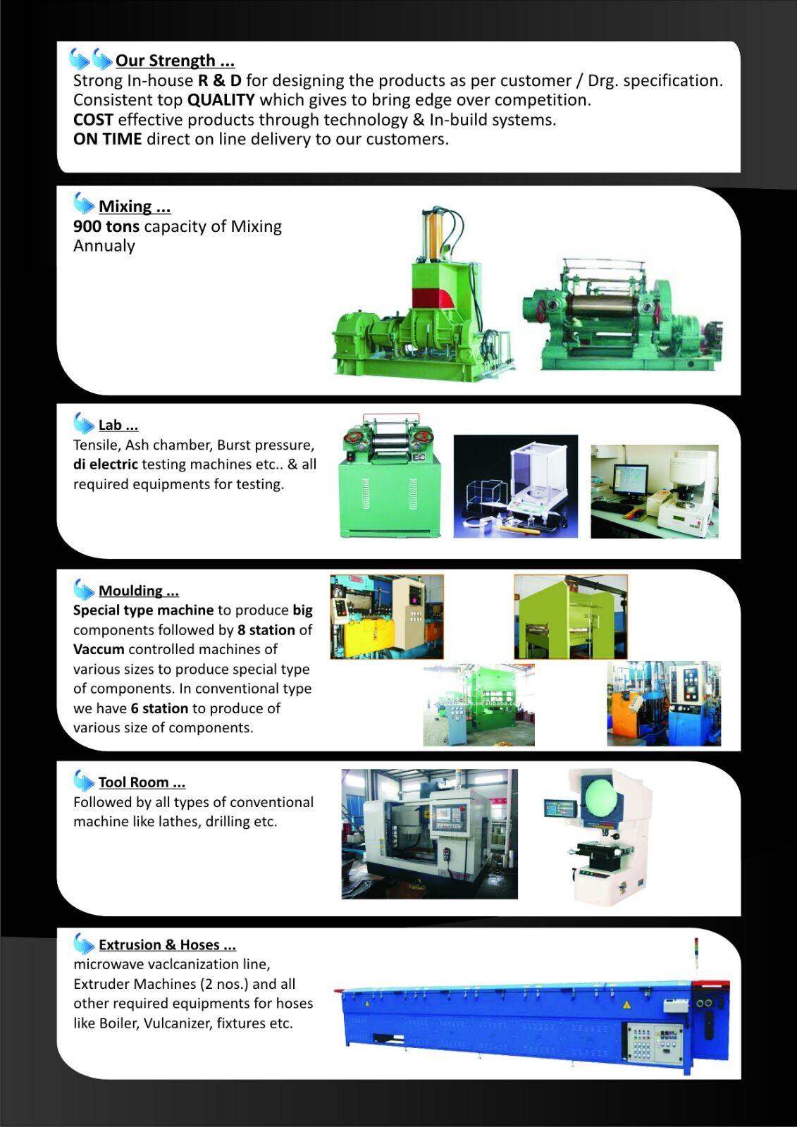 We are the manufacturers of Rubber Hoses, Extruded Profiles all types of moulded components for automotive and non-automotive sectors from NR, SBR, EPDM, Nitrile(PVC), Neoprene, Silicon, Vamac, ECO, Viton and Polyacrylic rubber. We produce 15 million numbers in all annually. We are certified and been registered as SSI having a plot area of 11,000 sq.ft. with working area of 9,000 sq.ft. and 1400 sq.ft. office